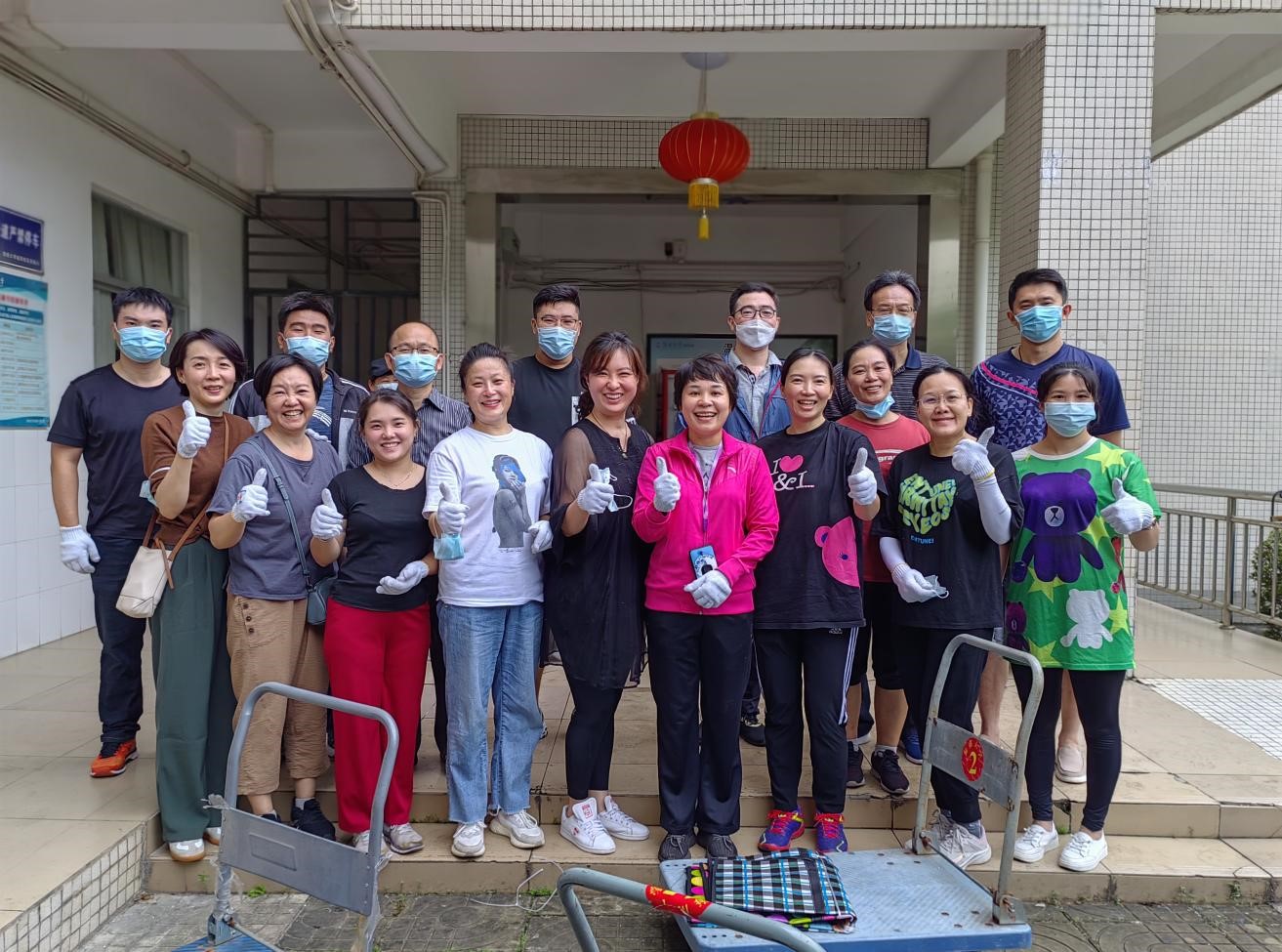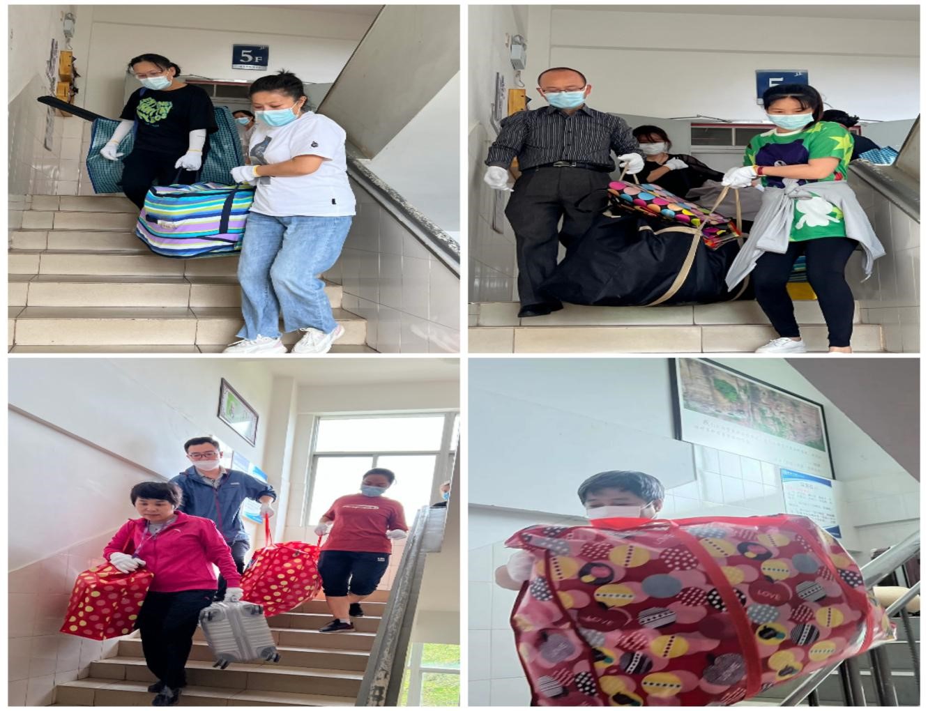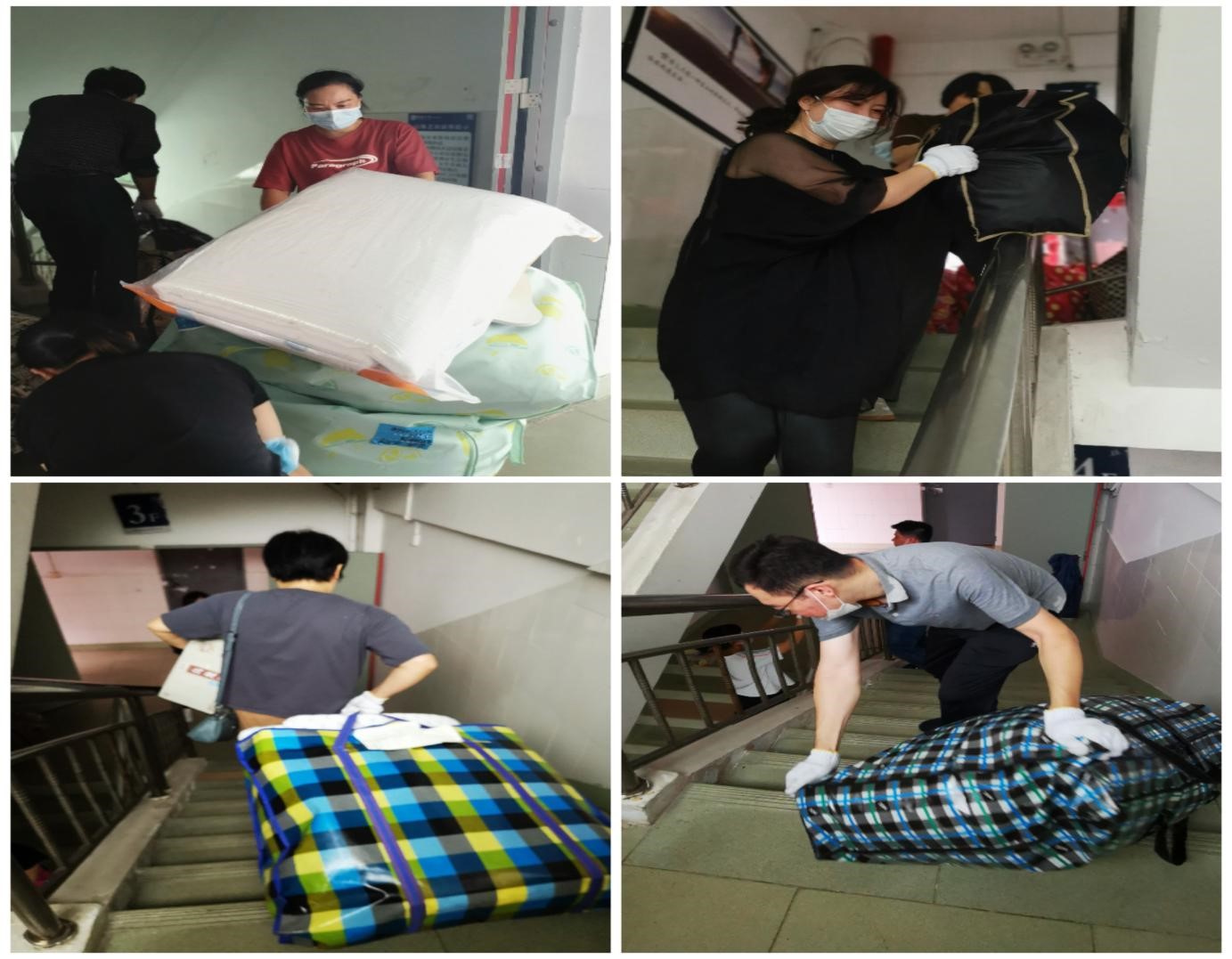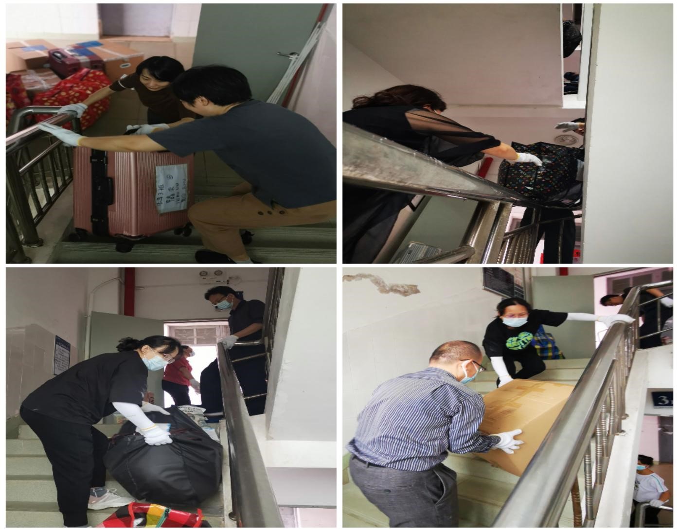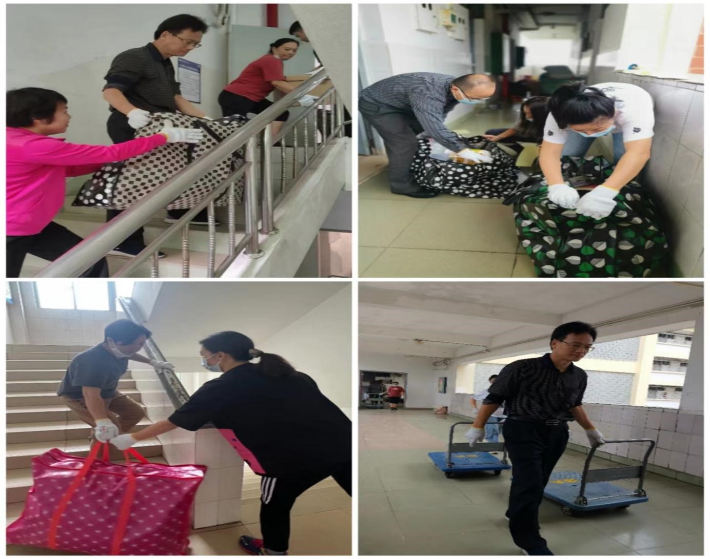未返校的124名员工的行李物品存放在城西校区两栋宿舍楼的2层到7层共 60间宿舍中,大约有近750件大小的行李物品需要搬运。因为行李物品数量庞大、志愿者人数有限、楼层高和天气差等原因,给搬运工作带来了很大的困难,但在公司经理、书记的指导下,搬运工作井然有序。大家本着“一切为了员工,为了员工一切”的原则,合理分工、团结合作、毫无怨言,以高度的责任心、细致入微的作风展现了法学教师的风采。正所谓“人心齐,泰山移”,老师们你传我递、你推我拉、跑上跑下、汗流浃背的画面成为校园里一道道感人的风景线。在william威廉亚洲员工工作部和晨曦书院的支持下,大家用一个小时完成了32名男生行李的搬运,用3个小时完成了92名女生的行李搬运。中午12:40,行李搬运工作安全、有序、顺利完成。