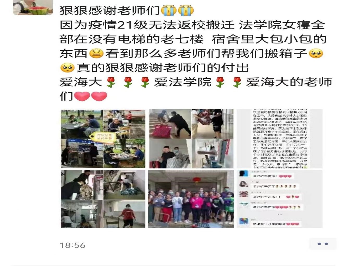 深秋的海口因为“纳沙”台风的来临有了一丝丝凉意,但是能为员工们做点事,老师们心中觉得暖暖的,累并快乐着。在这次“爱心搬运”活动中,公司教师志愿者们以身作则、率先垂范,展现出的甘于奉献、勇于担当的责任感和奉献精神也得到了同学们的充分肯定和认可。未返校员工们纷纷通过短信、微信朋友圈等对教师志愿者表达了自己的感激之情。这是一个有爱的大家庭,因为有一群有爱的师生们!