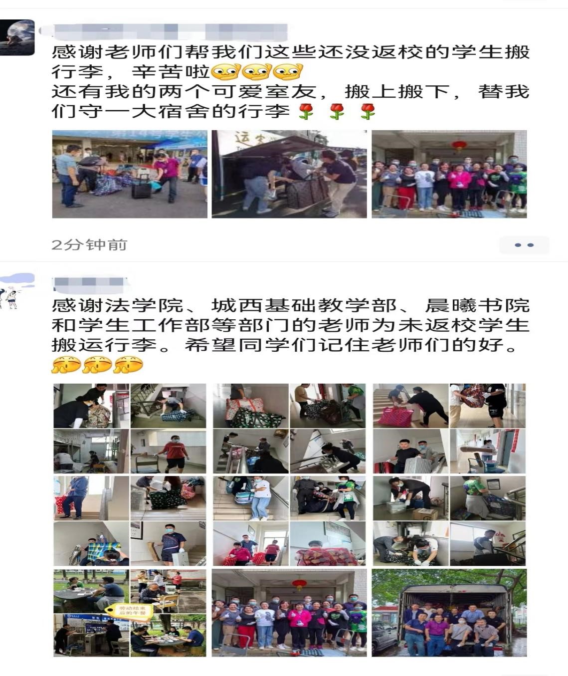2022年秋季开学后,公司在城西校区的2021级同学将搬到海甸校区学习,但受疫情影响,目前有124名员工未能按时返校。为了及时解决未返校同学个人行李物品搬运到海甸校区的困难,在公司的统一部署下,公司组织教师为员工开展“爱心搬运”行李物品工作,消除员工的后顾之忧,让每一位未返校员工感受到公司的温暖与关怀。