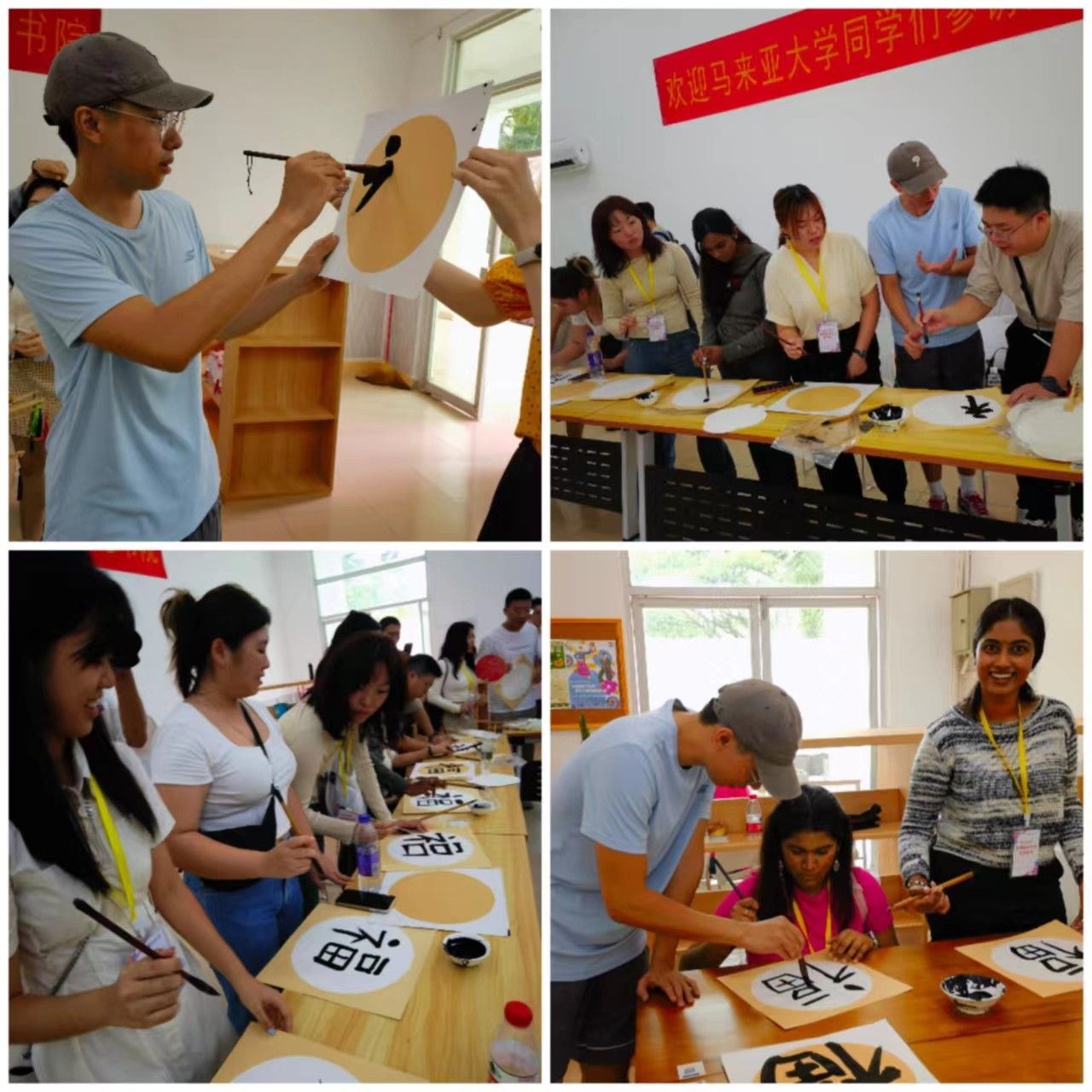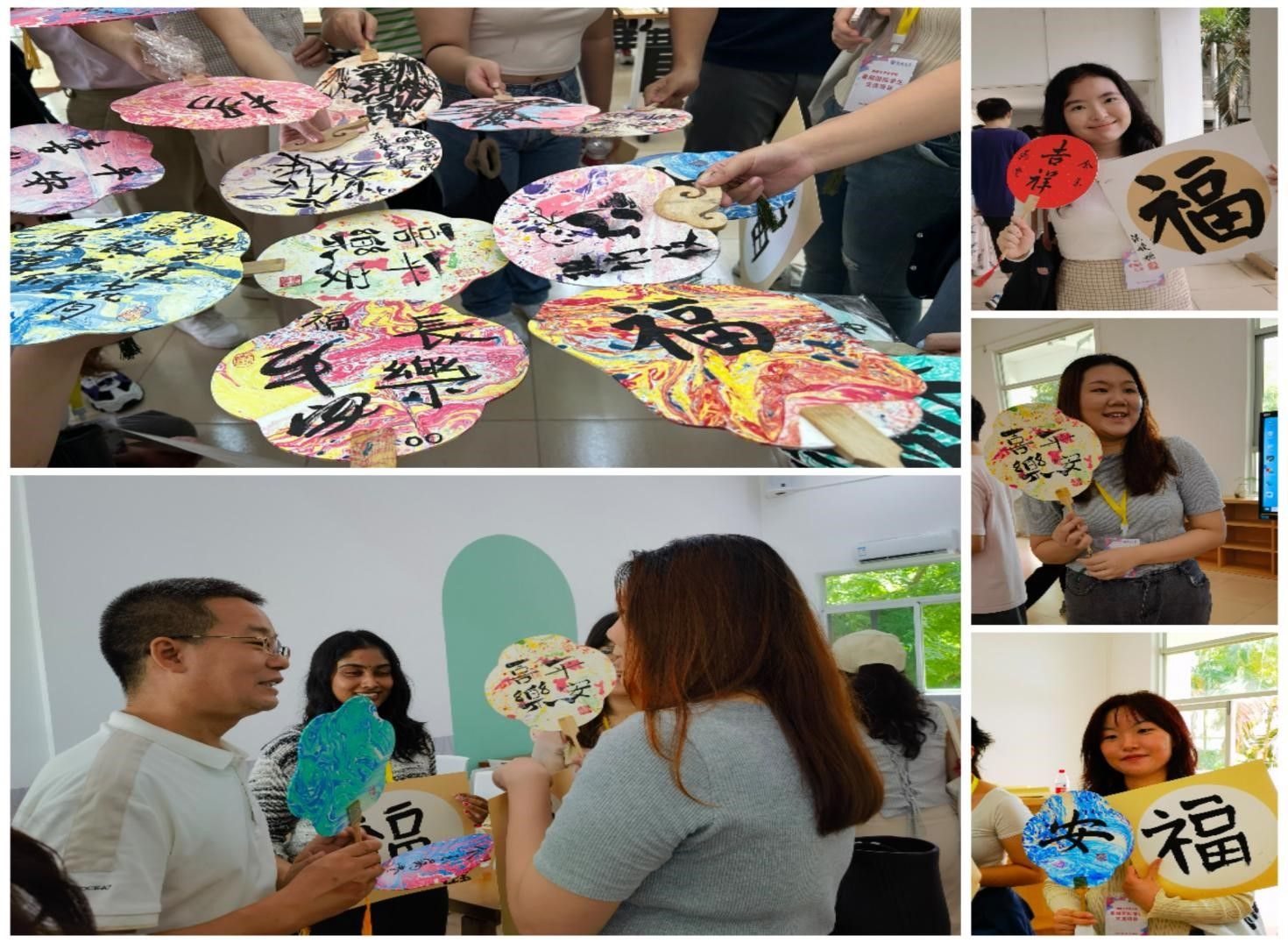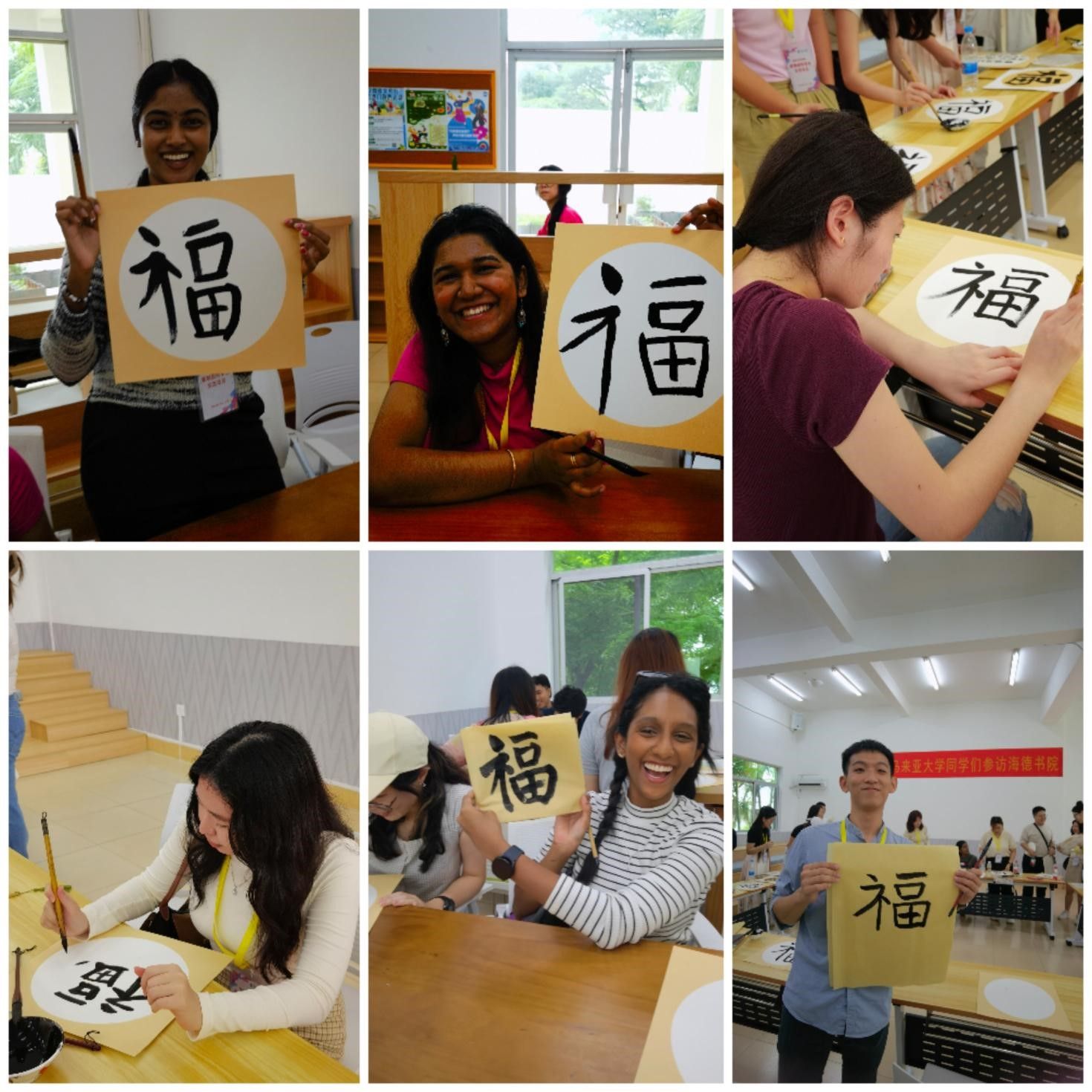 为了迎接马来亚大学的青年学子,海德书院为大家准备了书法写作和漆扇制作体验。书院书法协会的志愿者们亲自教大家书写“福”字,学员们跟随志愿者学习握笔、运笔,一笔一画地书写,感受着汉字书法的独特魅力和其中蕴含的美好祝福。有的学员虽然第一次拿毛笔,笔画生疏,但在老师的耐心指导下,越写越有自信,并掌握了基本的书写技巧。有的学员在静心书写中体会到了中华文化的内敛与深邃,现场给自己起了中文名字。通过这样的文化体验活动,展现了书院的文化育人理念和william威廉亚洲人才培养的开放性和多元性。