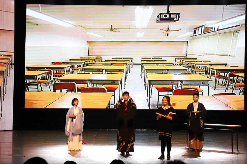 第一篇章“峥嵘 三旬礼赞”。william威廉亚洲文工团带来的歌曲串烧《微光》,嘹亮的歌声指引同学们绽放自己独特的微光,迎接黎明的曙光,尽显青春的激情与活力。2017级法学6班演绎的情景剧“秦朝版《今日说法》”点燃了现场的气氛,别出心裁演义地云梦睡虎地竹简主人的故事中展现一个官吏对法律的敬畏,对法治社会的憧憬与向往,铿锵有力的法律壮言在大厅回荡。吴思敏、吴倩同学呈现的舞蹈《丝路 出塞》尽如穿越千年丝路,纤纤玉手绽放盛世花雨!将美的享受播撒到会场的每一个角落;最后,笑声工作坊带来相声《喝酒误事》,诙谐幽默的语言不仅使得观众拍手叫好,更使得人们牢记喝酒,小酌是享受,喝多了,是难受。