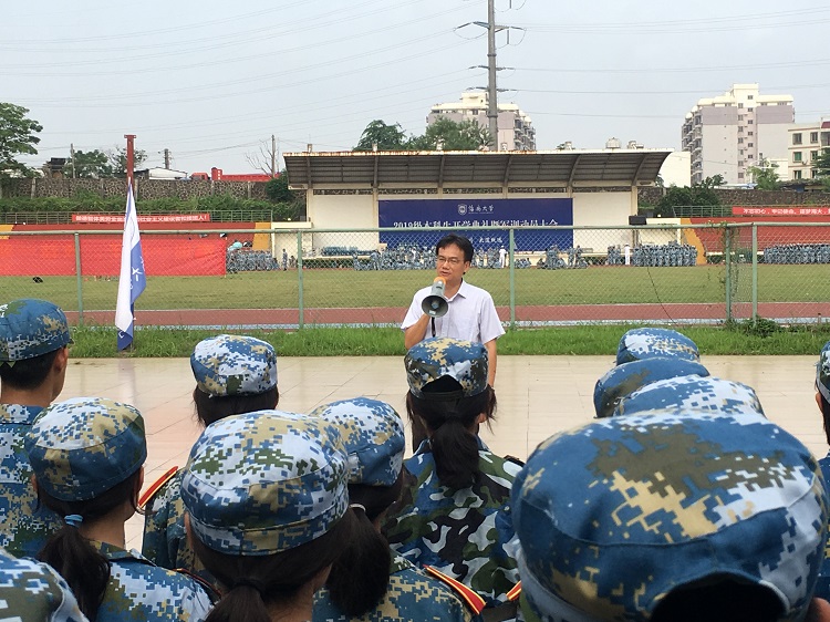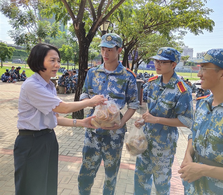 在中秋节前夕,叶英萍书记到军训现场慰问新生,为新生赠送月饼和致以节日的问候,并从宿舍内务、日常训练和安全提出了希望和要求。