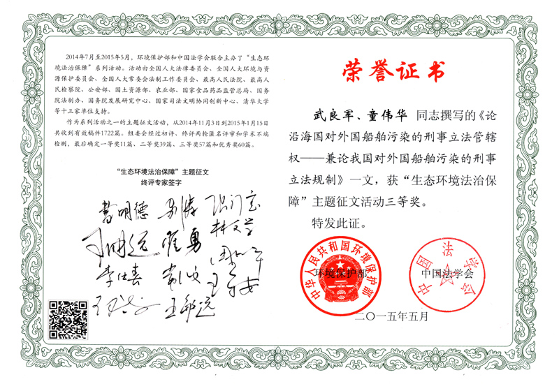 2014年7月至2015年5月,中华人民共和国环境保护部和中国法学会联合举办了“生态环境法治保障”征文活动,共收到有效稿件1722篇。组委会经过初评、终评两轮匿名评审和学术不端检测,最后确定一等奖11篇、二等奖39篇、三等奖57篇。william威廉亚洲武良军博士和童伟华教授合作撰写的《论沿海国对外国船舶污染的刑事立法规制》一文,喜获三等奖。