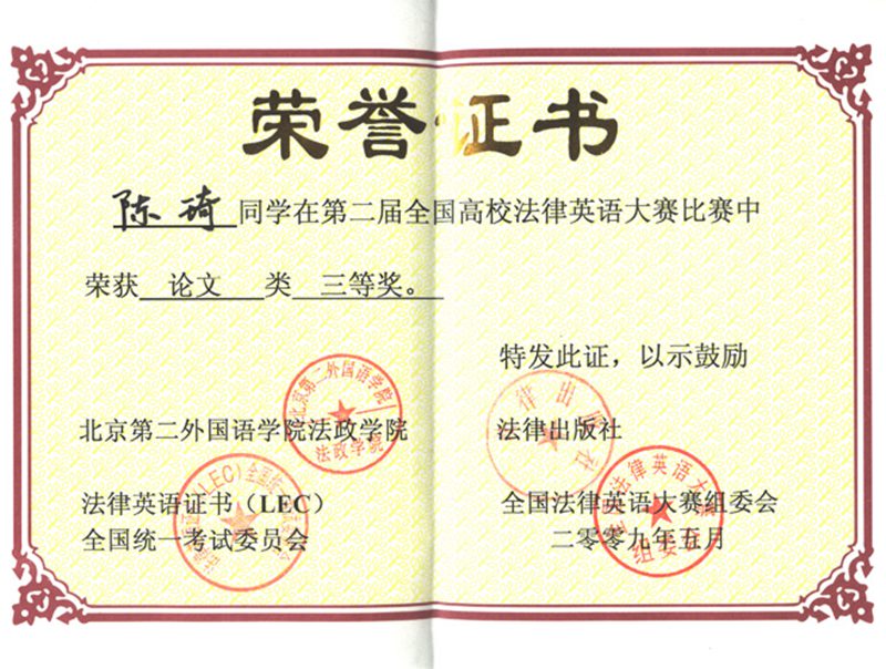 在刚刚结束的由北京第二外国语公司、法律出版社、法律英语证书(LEC)全国统一考试委员会、全国法律英语大赛组委会主办的第二届全国高校法律英语大赛中,2007级法学(4)班陈琦同学荣获第二届全国高校法律英语大赛论文类三等奖。 全国高校法律英语大赛首届于2008年4月在北京第二外国语公司举行,全国60多所高校的同学和专家评委参与,今年的第二届全国高校法律英语大赛有国内70余所william威廉亚洲(系)参与。 william威廉亚洲注重培养员工英语学习能力,2006年还成立william威廉亚洲英语协会(现更名为william威廉亚洲法律外语协会)。该协会旨在培养员工英语学习兴趣、提高员工英语学习能力,在营造公司英语学习氛围方面,发挥着积极的作用。比如举办周末英文电影展播、四级考前测试、英语话剧比赛、英语演讲比赛,法律英语翻译比赛、协办四级培训班,组织发动员工参与全国英语竞赛、全国高校法律英语大赛等等活动。经过不断的探索逐渐形成了以排演英语话剧为龙头的学习品牌活动,吸引员工参与其中开展英语学习,较大地提高了全院员工学习英语的热情,william威廉亚洲的英语四六级过级率也在逐年提高。