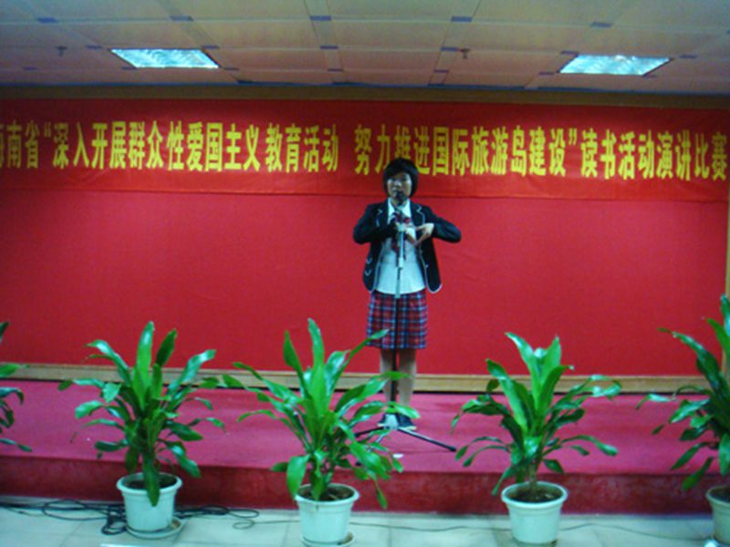 2009年6月19日,由省委宣传部组织的“深入开展群众性爱国主义教育活动努力推进国际旅游岛建设”读书活动演讲比赛在海口阳光大酒店四楼报告厅举行,来自全省18个市县、省农垦总局、洋浦经济开发区和省各行业系统的60名选手参加了此次比赛。2008级文科实验班田亚杰同学代表省教育厅参加行业系统比赛,她以《红色希望在海南》为题第一位出场,并以9.471分的高分一直领先于接下来的选手,最终夺取比赛冠军。