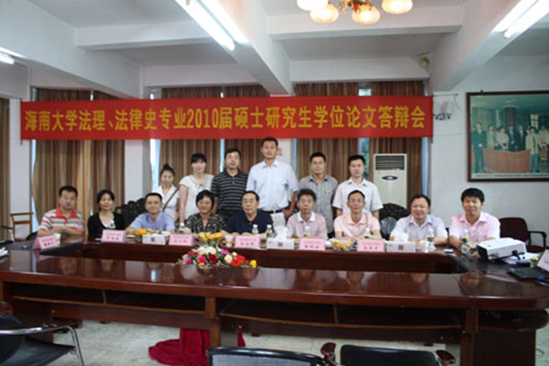 第一组答辩的是法学理论专业的三位同学。杨荣的论文题目是《特殊的团体本位:海南黎族传统社会组织与首领习惯法分析》;朱琳的论文题目是《海南黎族习惯法的基本价值探析》;温波的论文题目是《论拉德布鲁赫价值相对主义法哲学》。第二组答辩的是法律史专业的三位同学。彭传林的论文题目是《黎族“刑事”习惯法研究》;关丹丹的论文题目是《“女性的身价”:黎族传统社会婚姻家庭习惯的一种表述》;罗涛的论文题目是《黎族传统纠纷解决机制研究》。六位同学分别按照答辩程序阐述了各自论文的选题背景、主要内容、创新和不足,并流畅地回答了答辩委员会成员提出的问题。 答辩委员会认为,本次的论文五篇写黎族习惯法,具有浓厚的海南区域性特色;以少数民族习惯法为中心,极具特色,丰富了我国的多元法文化。另外一篇写拉德布鲁赫相对主义法哲学,视野开阔,极具价值。六篇文章都凝聚了六位同学心血,特别是资料的收集和文献的解读,六位同学都做得非常好。六篇文章的一些观点新颖独到,具有创新性。与此同时,答辩委员会也指出了六篇文章中存在的一些问题,如文字和格式问题、论文结构问题等。但瑕不掩瑜,答辩委员会成员一致认为六位同学的论文质量较高,达到了硕士学位要求的水平,同意全部通过答辩。答辩会在与会人员的长时间掌声中结束。 六位同学全部通过论文答辩,并得到了答辩委员的高度肯定,成绩斐然。答辩会结束之后,答辩委员会所有成员与六位答辩人合影留念。 (文/09级法学理论 李松)