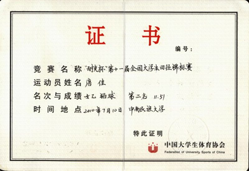 唐佳获奖证书