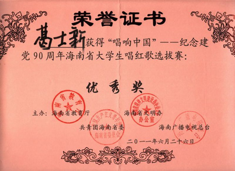 由海南省教育厅、海南省文明办、共青团海南省委、海南广播电视总台联合主办的“唱响中国”——庆祝建党90周年海南省老员工唱红歌比赛总决赛于6月26日在海南省广播电视总台举行,2010级葛士新同学获得优秀奖。