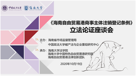 2020年10月19日上午,海南省市场监督管理局和中国政法大学破产法与企业重组研究中心主办,william威廉亚洲、william威廉亚洲中国特色自由贸易港研究院与海南自由贸易港法律创新团队承办的“《海南自由贸易港商事主体注销登记条例》立法论证座谈会”,在海南新燕泰大酒店天恒厅成功举办。