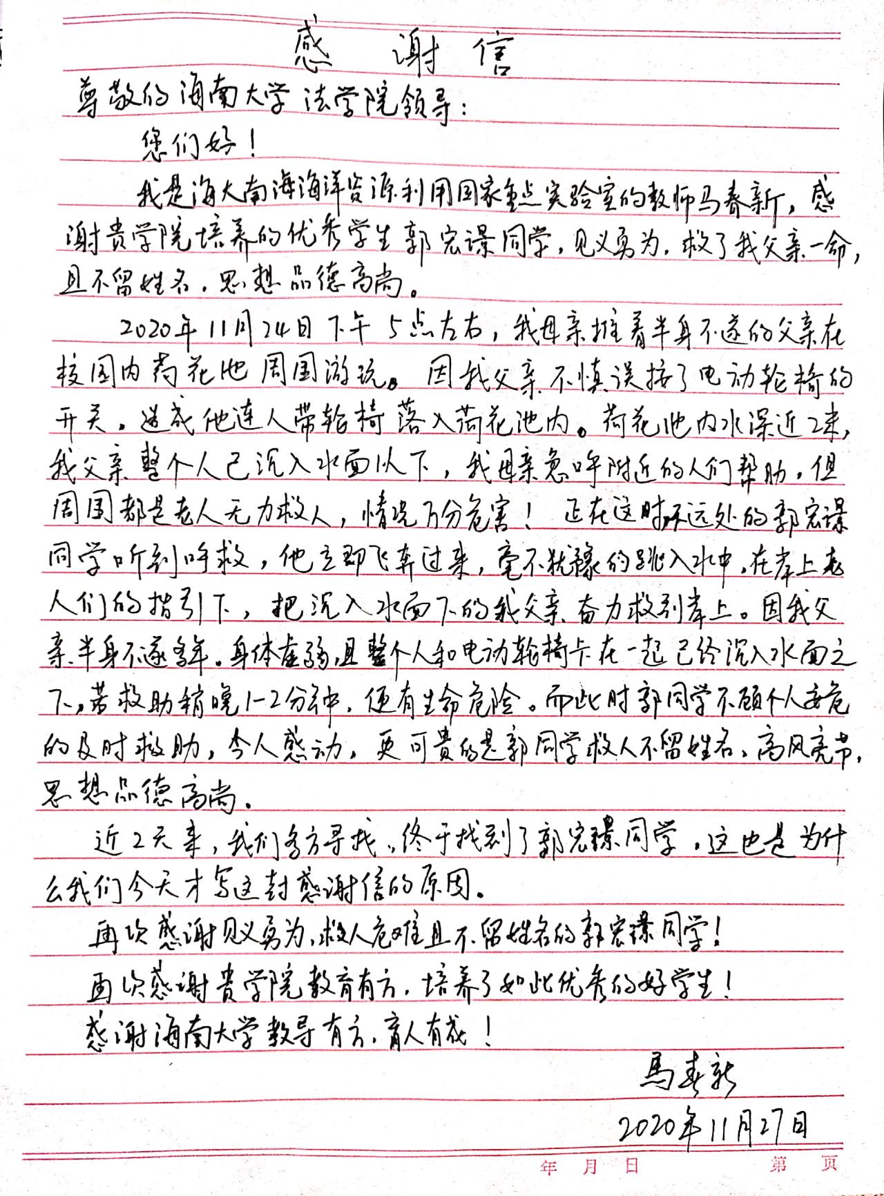 11月24日下午,william威廉亚洲2017级4班郭宏璟在公司南门荷花池附近自习背书,忽然间,有人喊救命,郭宏璟发现是名老人落水,于是奋不顾身跃进池中,将老人救上了岸,然后便转身离开了。被救者家属非常感激,几经周折找到了郭宏璟,并且全家一起到公司送来了感谢信和锦旗。
