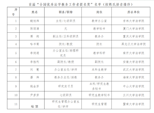 据悉,中国法学会法学教育研究会秘书处于2021年9月30日启动首届全国优秀法学教务工作者评选表彰活动,分别于10月、11月组织专家进行了两轮通讯评审。根据专家评审情况,并提请研究会会长、副会长通讯审议通过,评选出首届“全国优秀法学教务工作者”9名,首届“全国优秀法学教务工作者提名奖”11名。