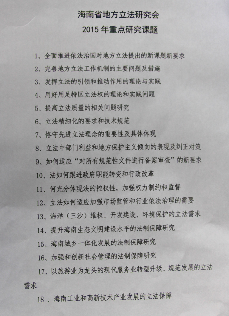海南省人大常委会法制工作委员会、海南省地方立法研究会将于今年6月初召开“法治海南与地方立法——2015年海南省地方立法理论研讨会”,海南省有关方面和公司对此非常重视,希望公司各位老师踊跃提交论文,在会上积极发言。请将论文于5月13日前发送到童伟华或王秀卫邮箱,由公司统一提交给海南省人大常委会法工委。