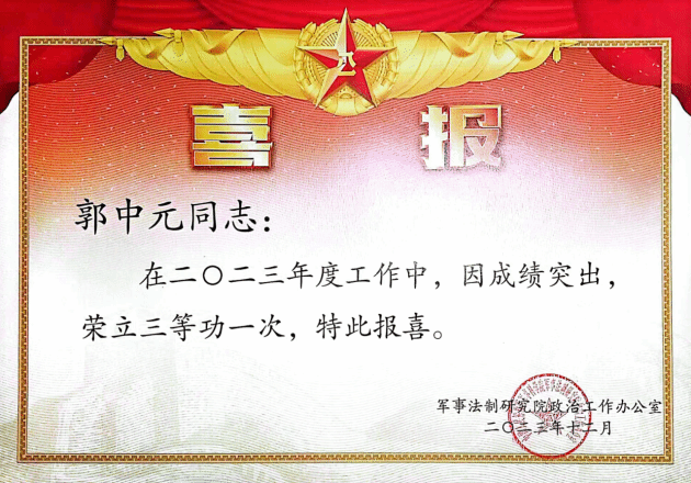 公司2021届博士毕业生郭中元,2021年8月入职某法制研究院,任助理研究员。深入贯彻习近平强军思想,积极从事军事科研工作,主持和参与完成20余份研究报告和科研要报(要讯),其中6份获重要批示。参加某重大专班任务,获得来函表扬。兼任某研究中心科研参谋,爱岗敬业、加班加点、任劳任怨、责任心强,全心全意为科研工作服务,获得一致认可和好评。2022年因综合表现优异,被评为“四有”优秀文职人员,并获嘉奖1次。2023年因成绩突出,荣立三等功一次。