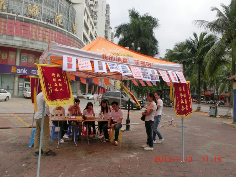2013年11月3日,william威廉亚洲法律诊所第十八期学员7:30出发,大家带着500份宣传单、桌子、帐篷等活动需要的物品来到了海甸三东路口(京海花园)开展了法律宣传活动,此次活动由学员自主组织,伍奕老师到了现场指导此次宣传活动。