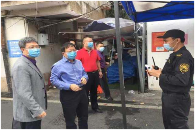 中心主任、william威廉亚洲党委委员、副董事长、william威廉亚洲新冠肺炎疫情防控工作领导小组常务副组长王崇敏(左二)现场检查指导疫情防控工作。