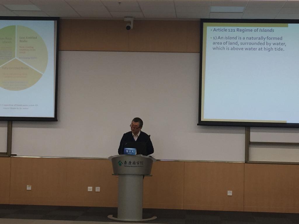 中心高圣惕教授在此次论坛发表了英文论文,并在会上作了主题发言,批驳中菲南海仲裁案实体裁决对于联合国海洋法公约第121(3)条的解释。高教授透过条约法公约第31条揭示的条约解释原则,指出仲裁庭实体裁决罔顾海洋法公约第121(3)条的目的及宗旨。彻底颠覆国际条约法核心的条约解释原则。